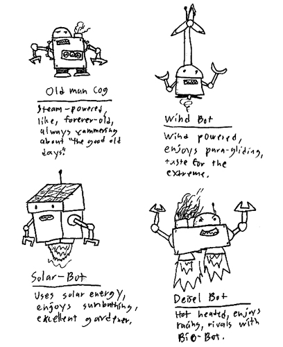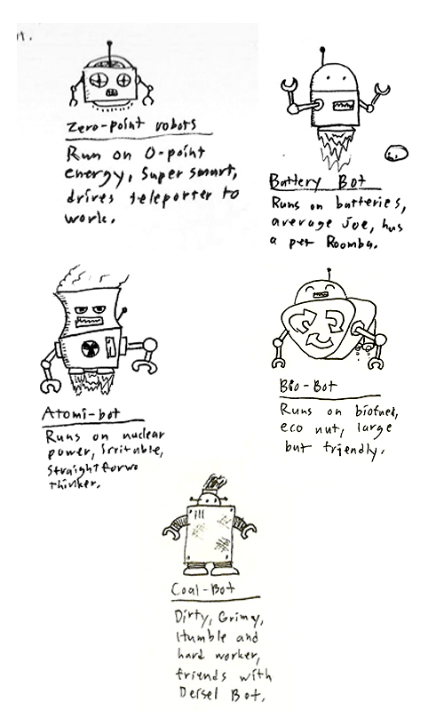 Hello everyone!  I just wanted to get to you with that family of robots I promised last time.  Each robot has a different power source, and that power source defines their personality. I would love to hear what you think of them or any other ideas for the robots!