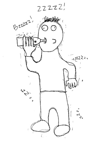 Hello everyone!  Last week I went and saw my dentist Dr. Jeff.  Dr. Jeff I’m afraid, is guilty of being one of the nicest people I have ever known!  Not only has he remembered our family through our tough year, but he also is our first sponsor of my CureSearch team, Cy’s Star Cluster.  During the visit, I was told that I need a filling in one of my teeth.  Afterward, I was gifted with a SUPERSONIC TOOTHBRUSH!  Actually, it’s just a vibrating one, but supersonic sounds cooler. My first time using the brush felt like a tiny robot was in my mouth and was thrashing violently in a desperate attempt to escape.  After a few days I got used to the strange sensation of having a vibrating toothbrush inside my mouth and I began to brag about all its amazing powers.  People get hilariously unsettled when you swing around buzzing and vibrating toothbrushes inches from their face.  They also might get angry; I do not recommend trying it.  On a happy note, the toothbrush is doing a wonderful job, leaving me with gleaming white teeth after each brushing.   All thanks to Dr. Jeff!  As a small thank-you for all his amazing kindness, I finally gave Dr. Jeff a special card.  It contained an honest thanks as well as a funny comic on the cover, inside, and back.  I have a scan of the front of the card, as well as a drawing of my first time brushing with the sonic toothbrush: