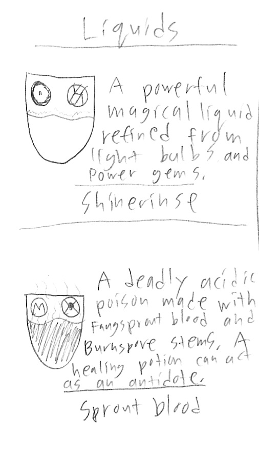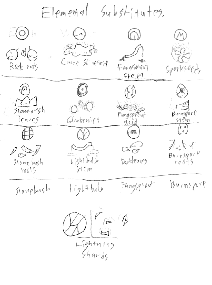 In alchemy, all elements have their counterparts embodied as individual features of a magical plant.  The parts are mixed in a cauldron of boiling shinerinse and the mixture is cooled when the potion making is done.  The following is a list of all the elements and their planty counterparts.