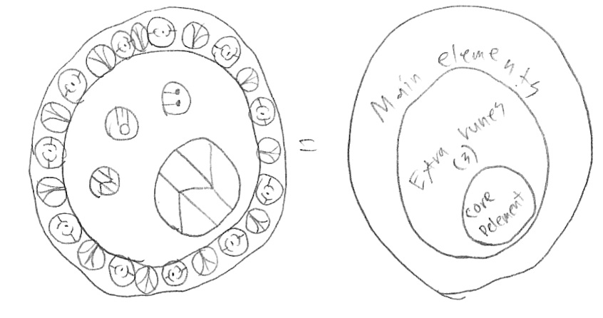Rune circles are spells confined to an area and are always triggered by a creature stepping within its boundaries.  Rune circles can have one primordial element, exactly 3 guidance runes (from the runology section,) and can have as many sophisticated elements as it can fit in the circle.  The symbols and runes are arranged like so: